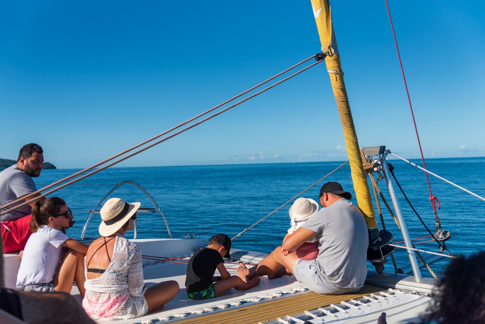 Regreso a bordo del barco para fondear en la playa de Carbet. Pausa para nadar para quienes lo deseen. Almuerzo criollo que será preparado y servido a bordo del catamarán por nuestro cocinero.